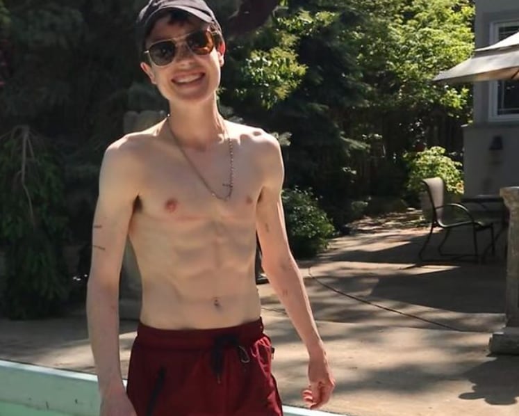 El actor, de 34 años, presumió su abdomen ejercitado en la imagen, que publicó en su red social con la siguiente frase: “Primer traje de baño del bebé trans”.