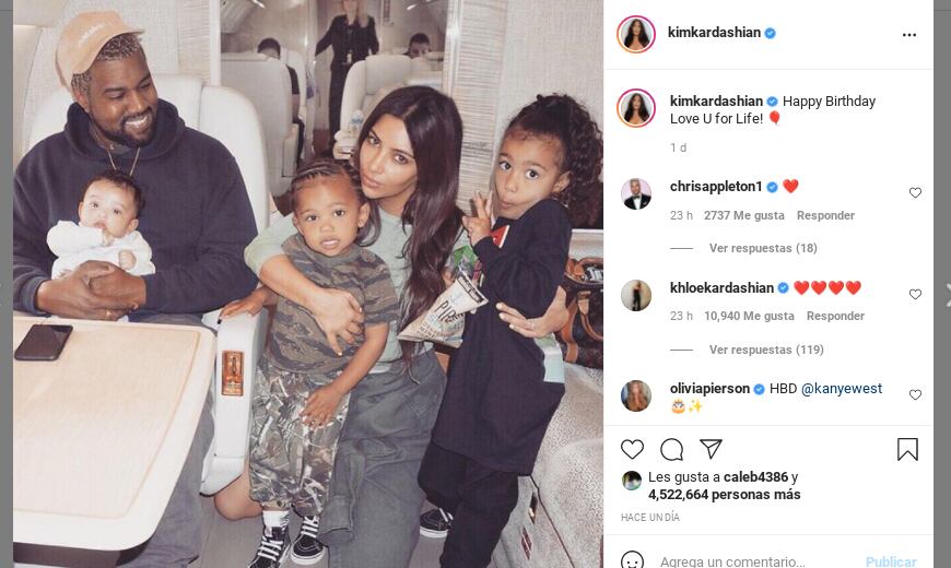 Kim publicó un mensaje de felicitación para Kanye. “Feliz cumpleaños. Te quiero de por vida”, escribió la socialité y empresaria en su cuenta oficial de Instagram, junto con una fotografía de ella con West y tres de sus hijos.
