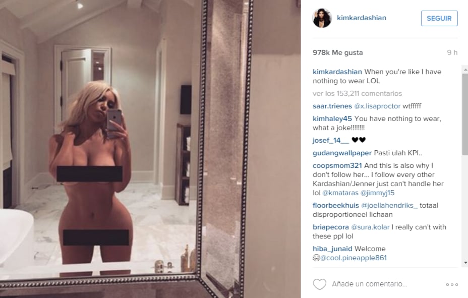 "Cuando estás como 'no tengo nada que ponerme' LOL", escribió junto a la imagen. La fotografía la muestra completamente desnuda; dos rectángulos negros es lo único que tapan sus partes íntimas.
