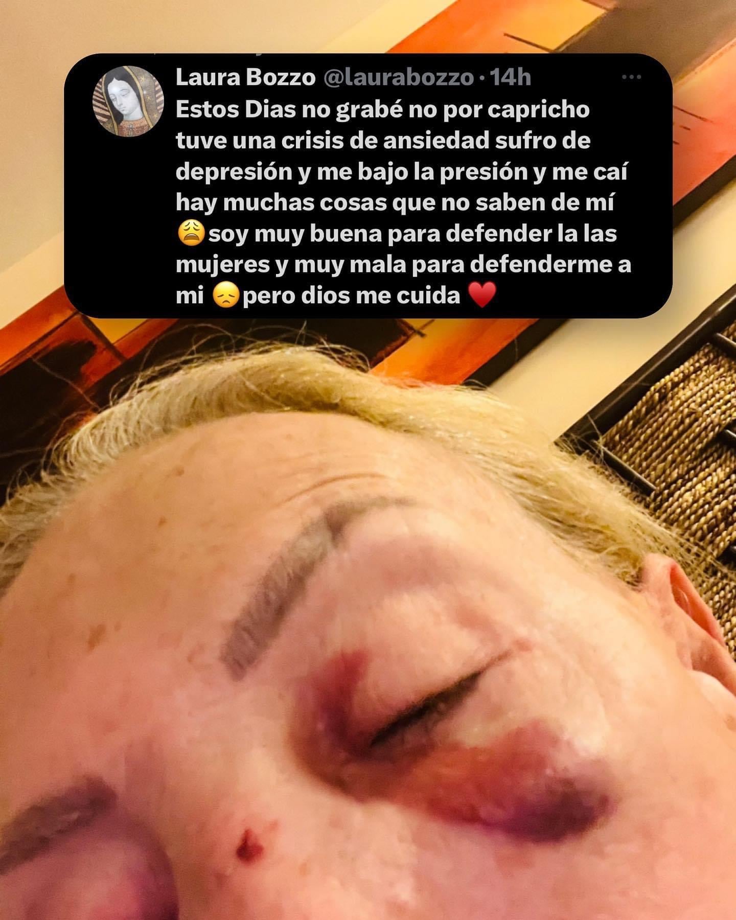 El mensaje de Laura Bozzo fue claro: padece de ansiedad y depresión, esto hizo que se le bajara la presión y sufriera una caída-Los golpes los recibió directamente en el rostro, lo que alarmó a sus seguidores, quienes le recomendaron grupos de ayuda y psicólogos.