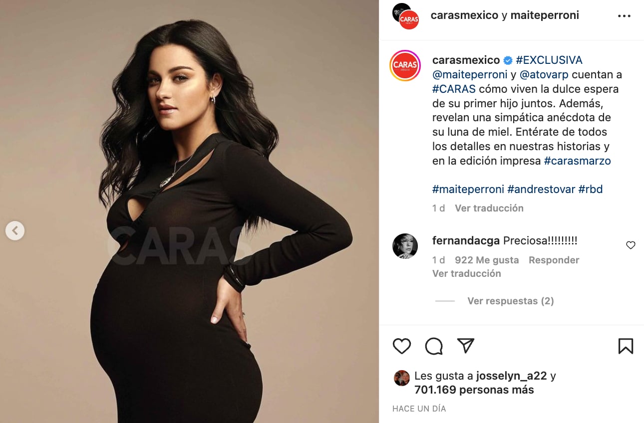 Adicional a las declaraciones, Caras también compartió una serie de fotografías de la cantante y su esposo, donde un vestido negro ajustado marca el vientre de Perroni y deja saber que el embarazo ya está en una etapa avanzada.