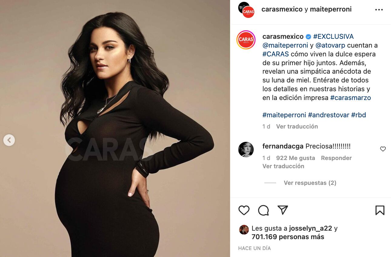 Adicional a las declaraciones, Caras también compartió una serie de fotografías de la cantante y su esposo, donde un vestido negro ajustado marca el vientre de Perroni y deja saber que el embarazo ya está en una etapa avanzada.
