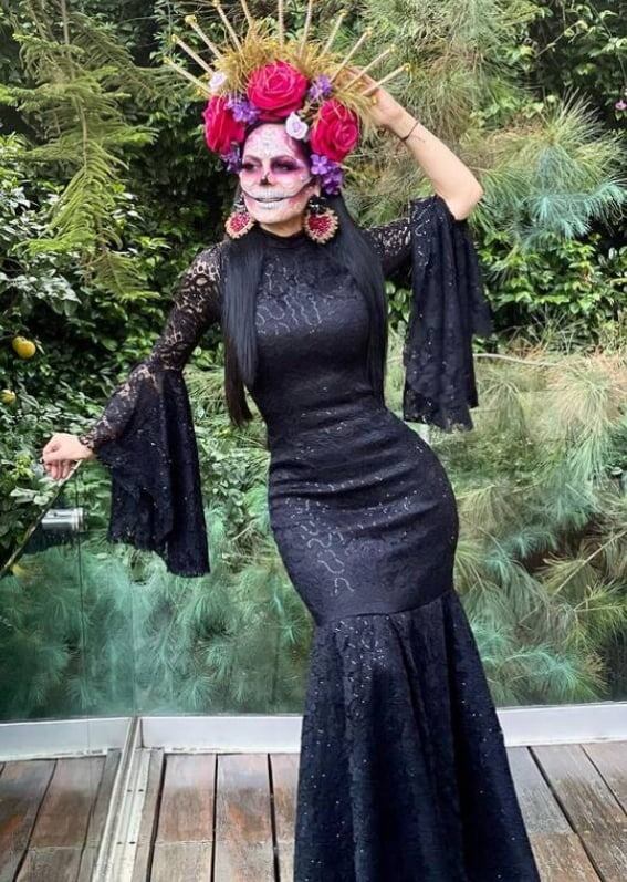 La costarricense usó un largo y entallado vestido de encaje negro que combinó con una corona de flores en su cabeza, así como el característico maquillaje de las catrinas.