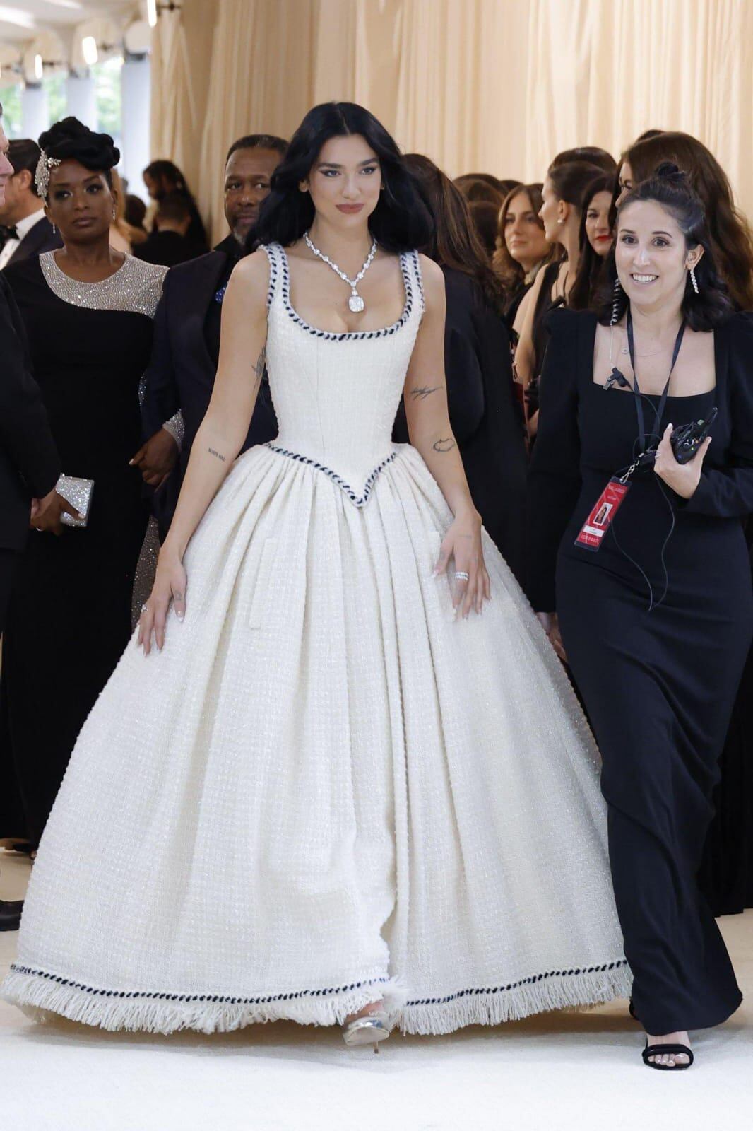 Entre las primeras estrellas en ser celebradas apareció la cantante Dua Lipa, quien lució un vestido de fiesta de tweed blanco y negro de Chanel, el mismo diseño que lució Claudia Schiffer para la colección de otoño de 1992. Pero su elección de accesorios asombró por un bello collar de diamantes estimado en $30 millones.