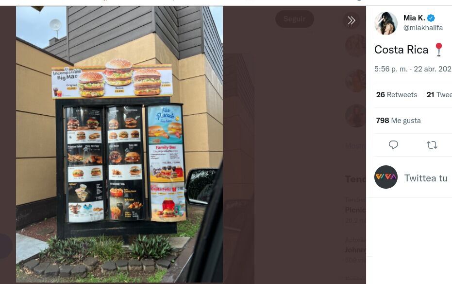 Después del primer tuit, Khalifa publicó una fotografía en el autoservicio de un restaurante de comidas rápidas. La imagen la acompañó con el título: Costa Rica.