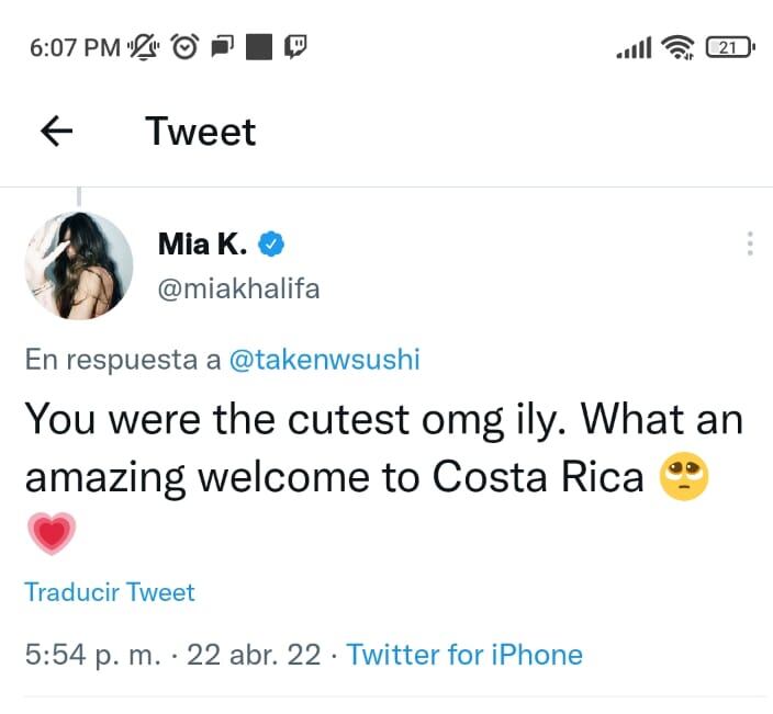 La exactriz porno Mia Khalifa estaría de visita en Costa Rica. Al menos así lo dio a entender la libanesa en un mensaje que publicó en su cuenta oficial de Twitter con el mensaje: “Ustedes son los más lindos. Qué bienvenida a Costa Rica”.
