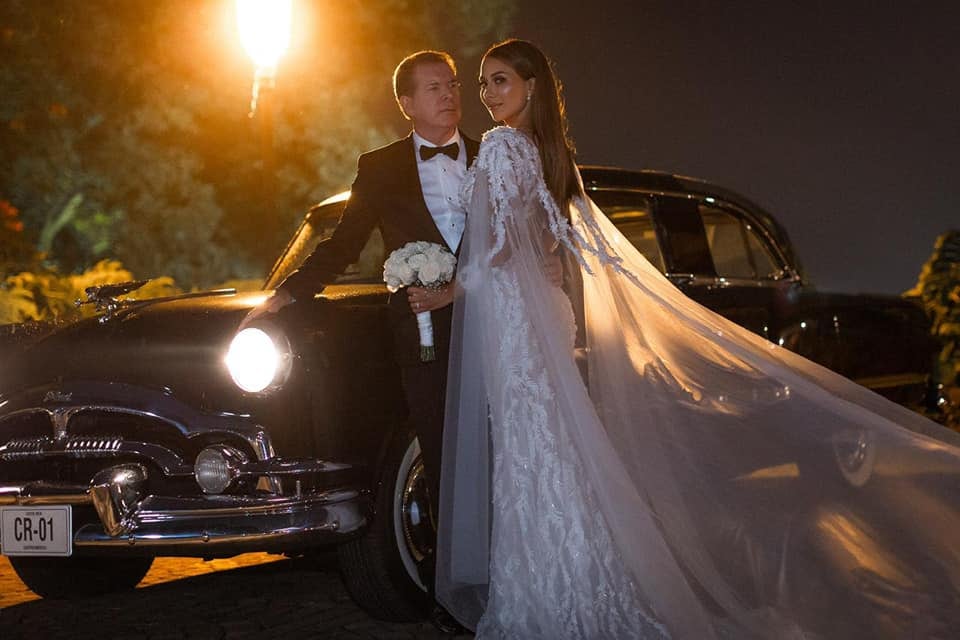 Correa, de 28 años, lució un vestido blanco inmaculado confeccionado por el diseñador Erick Bendaña, el mismo que le creó el traje de fantasía inspirado en el Oro Precolombino con el que ella compitió en el Miss Universo del 2017. Por su parte, Rodríguez, de 70 años, optó por un sencillo traje entero negro que acompañó de camisa blanca y corbatín negro.