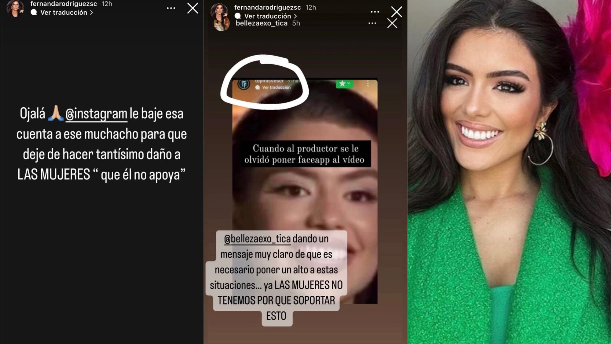 En sus historias de Instagram, Rodríguez aseguró que ya tiene la identidad del supuesto administrador de @topmissescr, por lo que ya puede reaccionar judicialmente. “Las mujeres no tenemos que soportar esto”, escribió la modelo en una de las publicaciones.