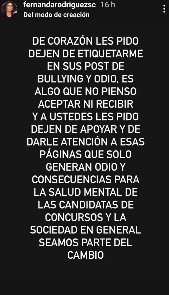 “A ustedes les pido dejen de apoyar y de darle atención a esas páginas que solo generan odio y consecuencias para la salud mental de las candidatas de concursos y la sociedad en general, seamos parte del cambio”, escribió Rodríguez desde Nueva Orleans, Estados Unidos, donde se encuentra preparándose para el Miss Universo, que será el 14 de enero.