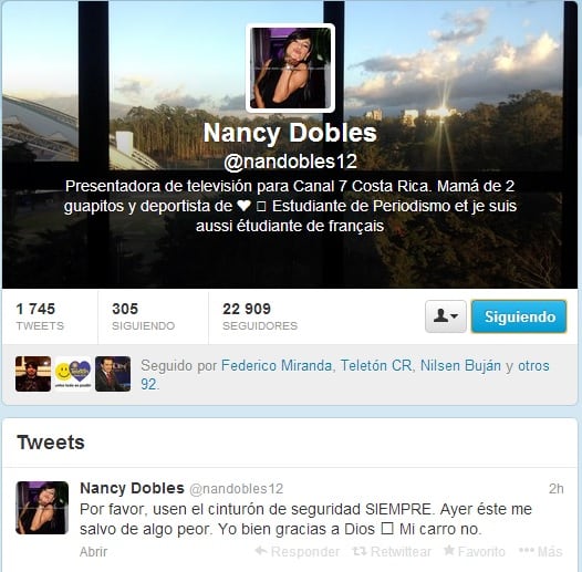La animadora iba hacia Escazú a recoger a sus hijos de la escuela. "Iba a pasarme de carril porque había unos trabajos en la pista, puse la direccional y solo sentí que un carro me dio por detrás", explicó Dobles.