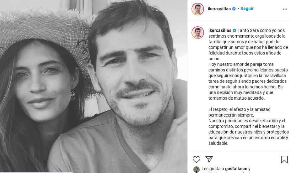 Tanto Iker como Sara informaron del término de su matrimonio en sus respectivas cuentas de Instagram. “Hoy nuestro amor de pareja toma caminos distintos, pero seguiremos juntos en la maravillosa tarea de seguir siendo padres dedicados como hasta ahora lo hemos hecho”, escribieron junto a una fotografía en blanco y negro donde posan juntos y sonrientes.