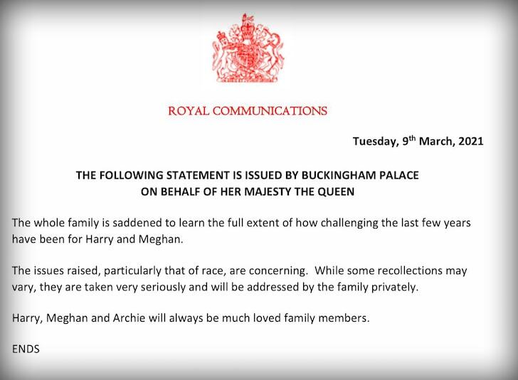 Tras más de 24 horas en silencio, este martes 9 de marzo el Palacio de Buckingham -en el nombre de la reina Isabel II- emitió un comunicado sobre la entrevista que ofrecieron el príncipe Enrique y su esposa, Meghan Markle, a la presentadora Oprah Winfrey.
