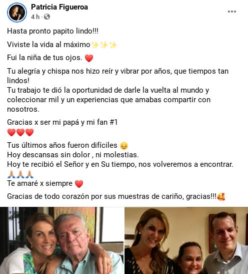 “Tu alegría y chispa nos hizo reír y vibrar por años, ¡qué tiempos tan lindos! Tu trabajo te dio la oportunidad de darle la vuelta al mundo y coleccionar mil y un experiencias que amabas compartir con nosotros. Gracias por ser mi papá y mi fan #1″, escribió Figueroa.