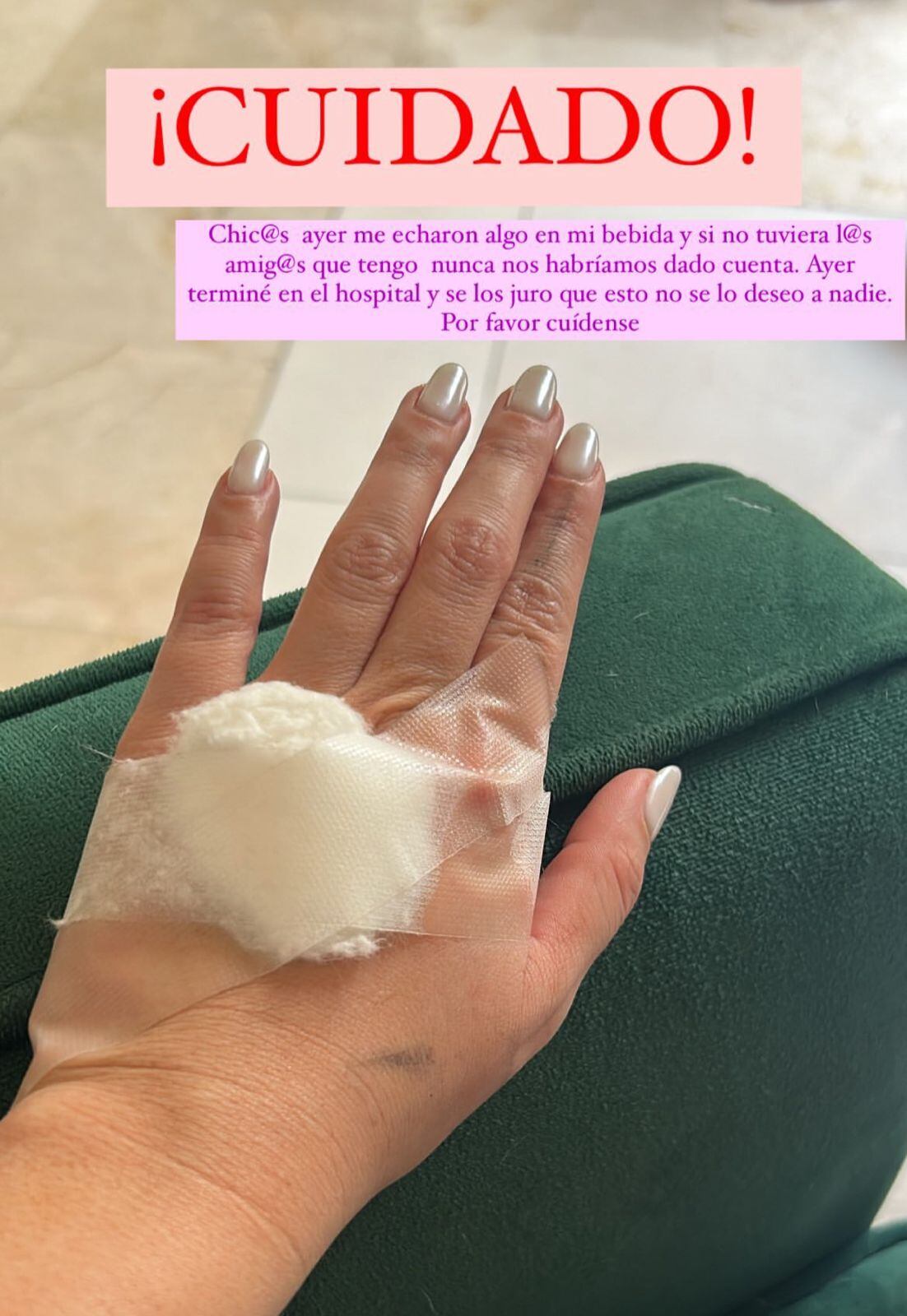 En dicha extremidad se ve que tiene un algodón, sostenido por una cinta de enfermería. La periodista comentó, que producto de lo ocurrido con su bebida, terminó en el hospital.