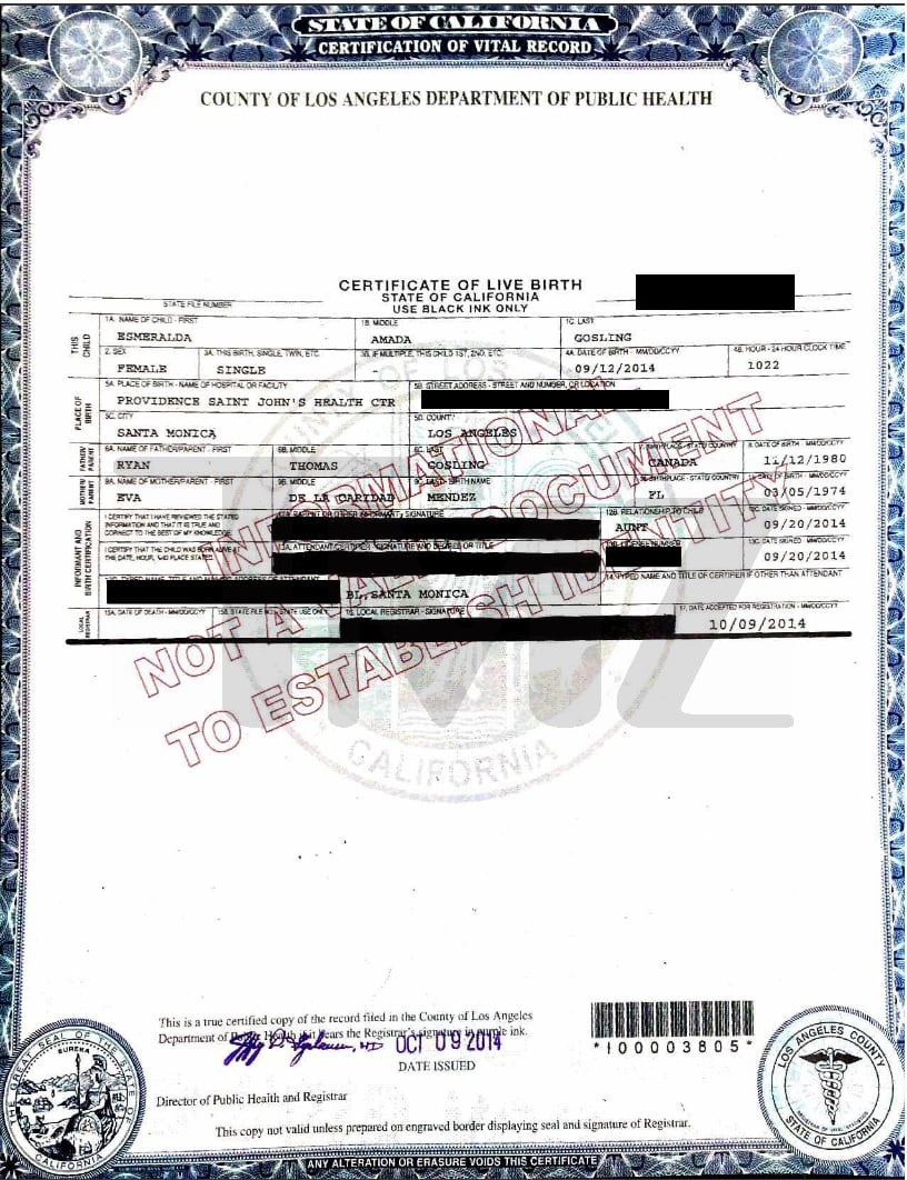 Ryan Gosling y Eva Mendes llamaron a su primer hija Esmeralda Amada