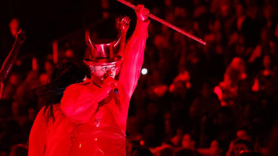 Ambos presentaron el tema Unholy en un escenario cargado de fuego y Smith cantó con un sombrero con cachos.