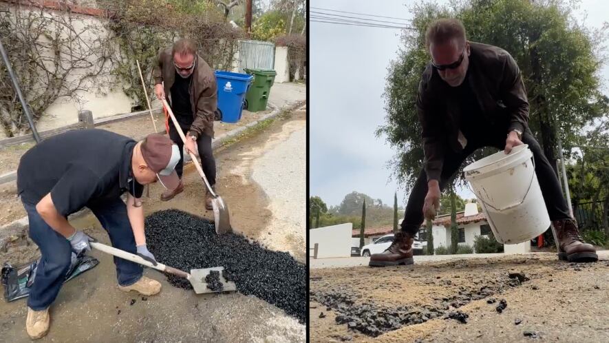 En la publicación que Schwarzenegger compartió en sus redes sociales, se le observa reparar la carretera del área de Brentwood con ayuda de una persona más. Incluso, emplea su herramienta para vaciar y expandir el concreto sobre la vialidad.
