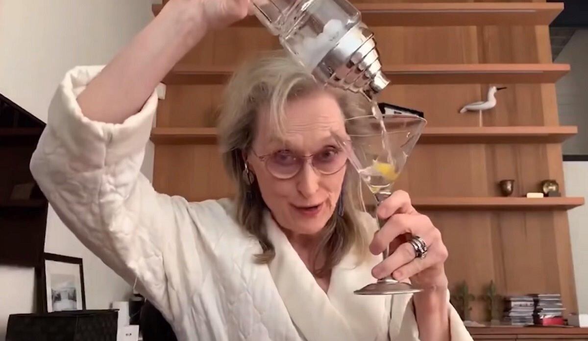 A Streep se le ve con gafas y en un momento se cansa de servirse cóctel tras cóctel, por lo que decide beber directamente de la botella de whisky.