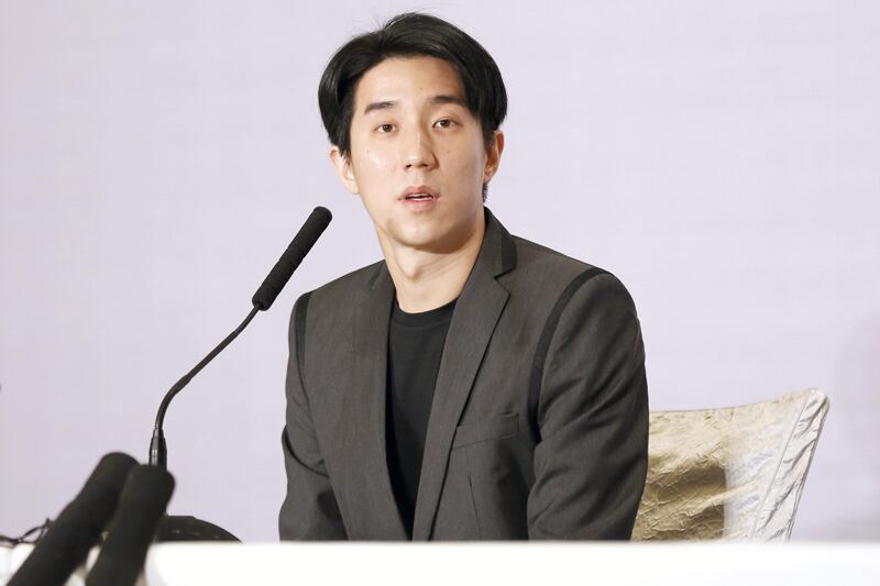 De traje negro y gris, con el semblante serio y acompañado de su representante, Steven Chang, Jaycee se postró frente a los periodistas al entrar a la sala abarrotada de cámaras, un gesto que repitió al salir y despedirse.