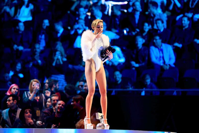 Miley Cyrus fue galardona por el videoclip Wrecking Ball , y subió al escenario vestida con un body blanco muy ceñido.