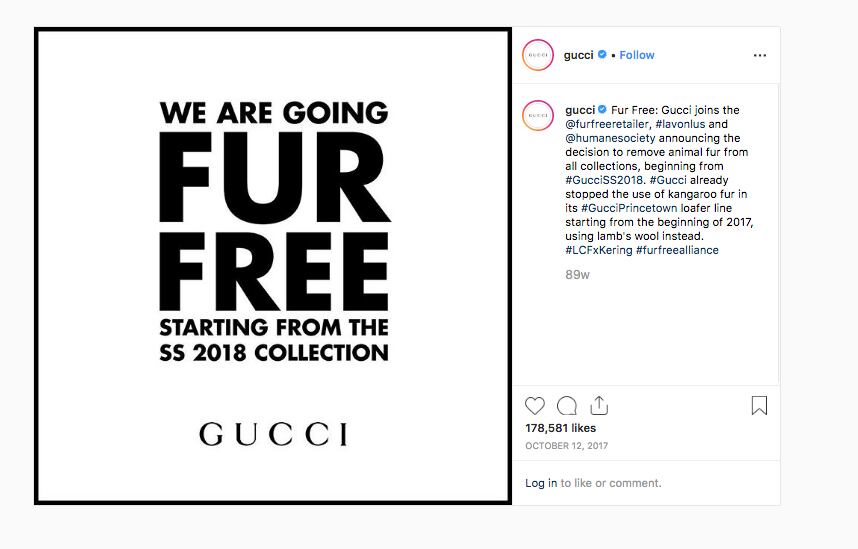 Gucci. Marco Bizzarri, presidente de Gucci, declaró en octubre del 2017 que entre las revoluciones que experimentaba la marca en manos del diseñador Alessandro Michele, incluía la prohibición de usar pieles en sus diseños.