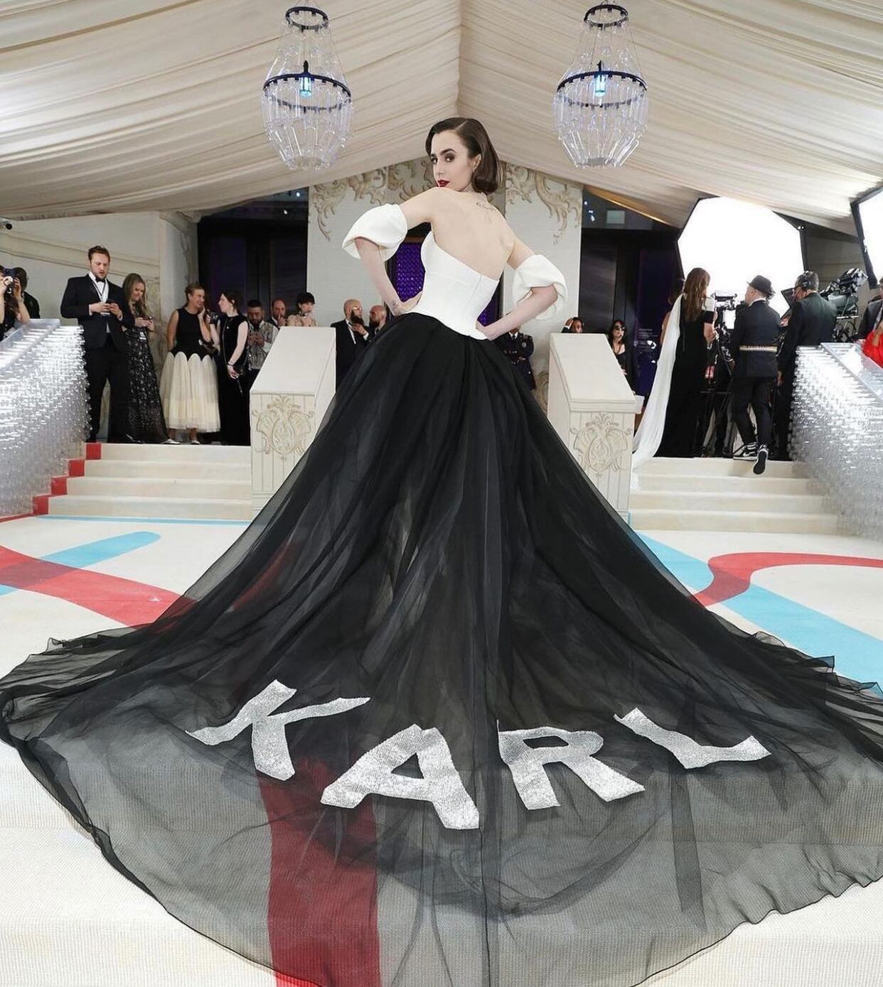 Otro atuendo halagado fue el de Lily Collins. La protagonista de Emily en París fue a lo seguro vistiendo negro y blanco. Ella llevó un diseño de Vera Wang que tenía un toque especial gracias a la larga cola en la que estaba bordado el nombre Karl.
