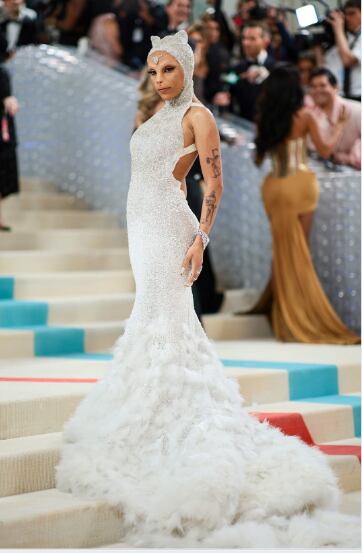 Doja Cat fue otra de las criticadas por llevar un diseño de Óscar de la Renta con cola de plumas y orejas de gato. La artista también quiso rendir homenaje a Karl a través de su adorada mascota.