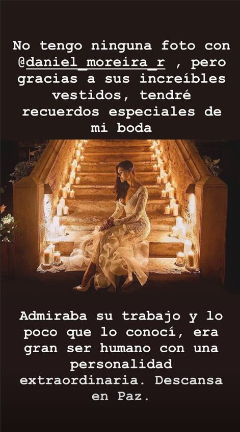 “Gracias a sus increíbles vestidos tendré recuerdos especiales de mi boda. Admiraba su trabajo. De lo poco que lo conocí supe que era un gran ser humano con una personalidad extraordinaria. Descansa en paz”, escribió Granados refiriéndose a Daniel Moreira.