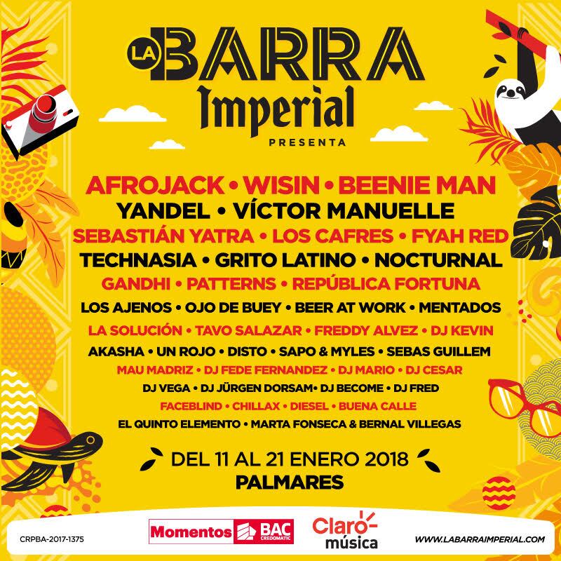 Esta tarde, la cervecería anunció de manera oficial la presencia de Yandel, Sebastián Yatra, Los Cafres, Afrojack, Bennie Man, Technasia, Wisin y Víctor Manuelle. También habrá una alineación de bandas ticas rock, ska y reggae.