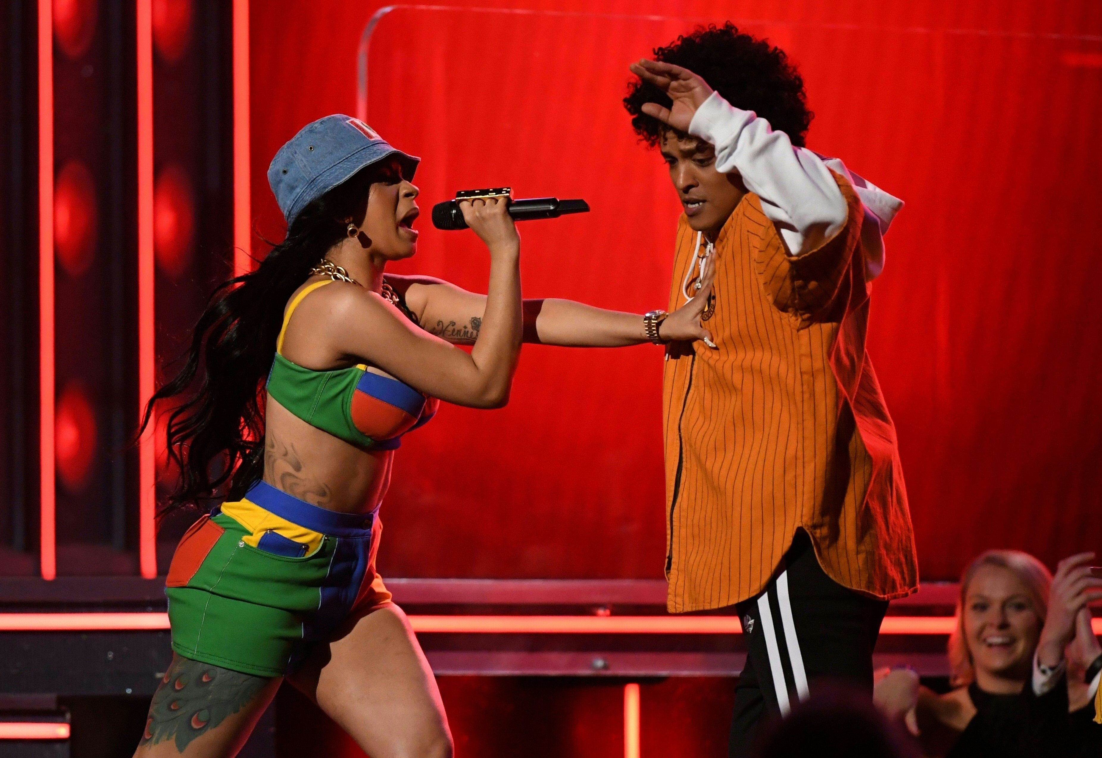 La energía se volvió a apoderar de recinto con la presentación de Bruno Mars, quien interpretó Finesse junto a Cardi B con un colorido aire ochentero.