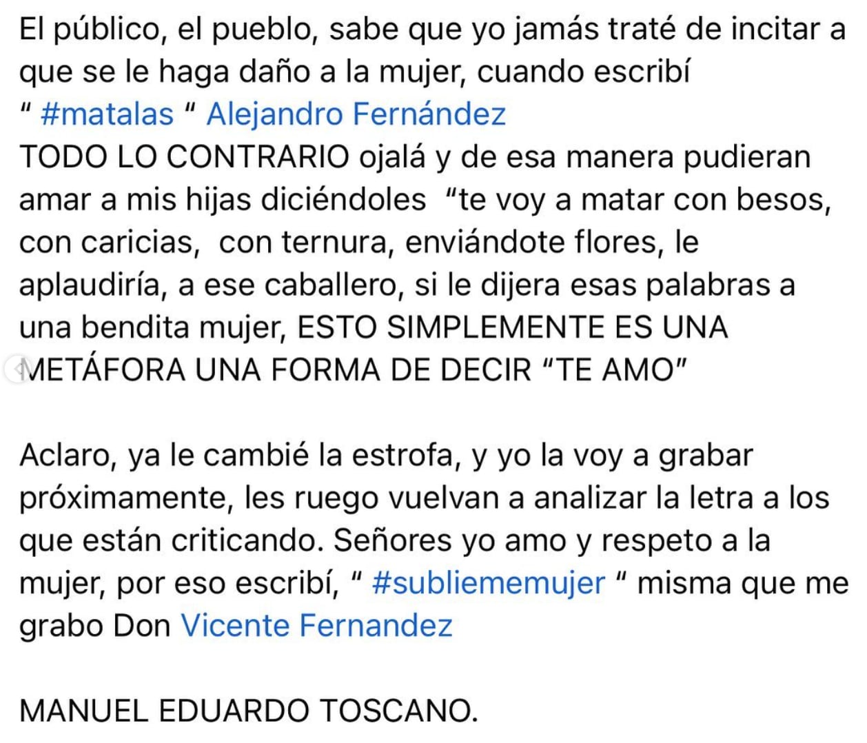 “El público, el pueblo, sabe que yo jamás traté de incitar a que se le haga daño a la mujer, cuando escribí Mátalas (...). Todo lo contrario, ojalá y de esa manera pudieran amar a mis hijas diciéndoles ‘te voy a matar con besos, con caricias, con ternura, enviándote flores’; le aplaudiría, a ese caballero, si le dijera esas palabras a una bendita mujer”, escribió Toscano en el comunicado, que compartió en su cuenta de Instagram.
