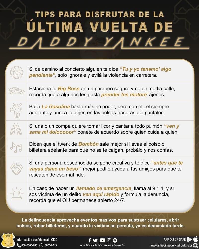 A propósito de que el boricua presentará el primero de dos conciertos de despedida esta noche en el recinto de La Sabana, el Organismo de Investigación Judicial (OIJ) se dejó contagiar por la fiebre del reguetón y publicó una creativa lista de recomendaciones para los asistentes al concierto muy a tono con el lenguaje de la velada.