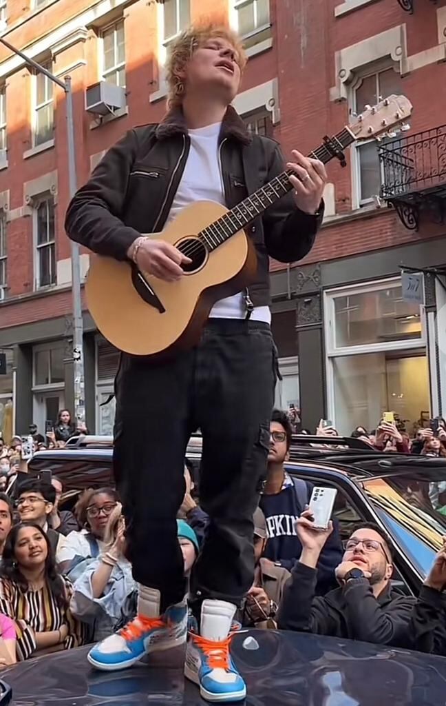 Luego, Sheeran saluda muy sonriente a los fans y opta por subirse sobre el techo de un auto, saca su guitarra, se la coloca e interpreta algunos de sus éxitos, incluyendo la polémica Thinking Out Loud.