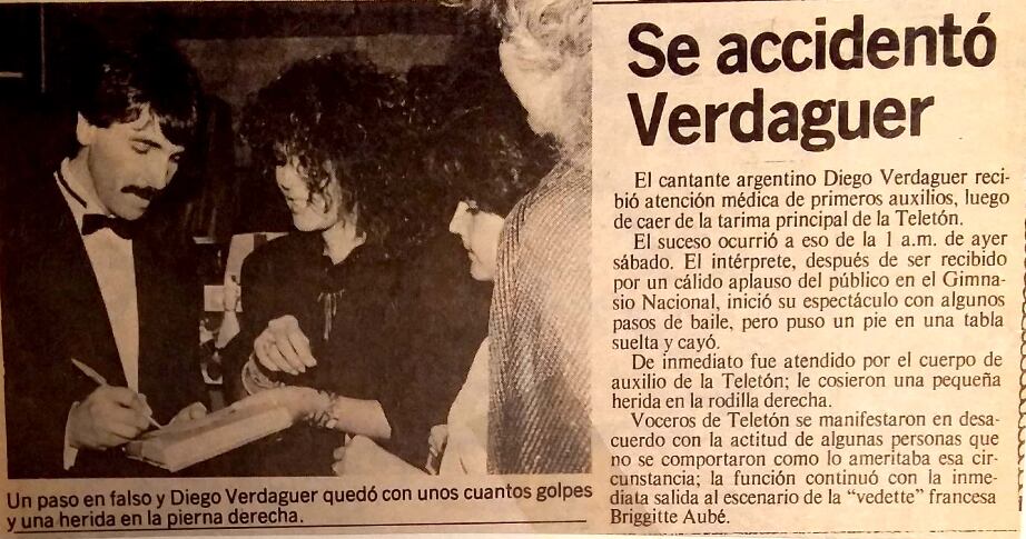 La Teletón de ese día continuó con la presentación de la vedette francesa Briggitte Aubé. Mientras tanto, detrás del escenario Verdaguer era atendido por el cuerpo de auxilio de la Teletón, pues producto del paso en falso el artista argentino quedó con múltiples golpes y una herida en la pierna derecha que requirió que el personal médico lo cosiera.