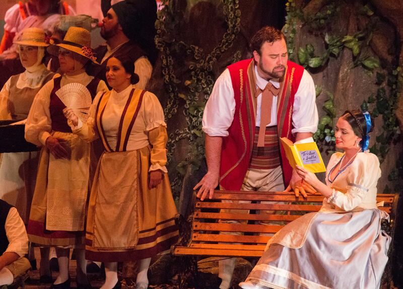 Sobre las tablas, una docena de miembros del Coro Sinfónico Nacional se tomaba fotos y bromeaba entre los muros de piedra y los árboles de la ópera bufa de Gaetano Donizetti. Al fondo se escuchaban las profundas voces del tenor y el barítono, ejercitándose para alcanzar las exigencias del bel canto.