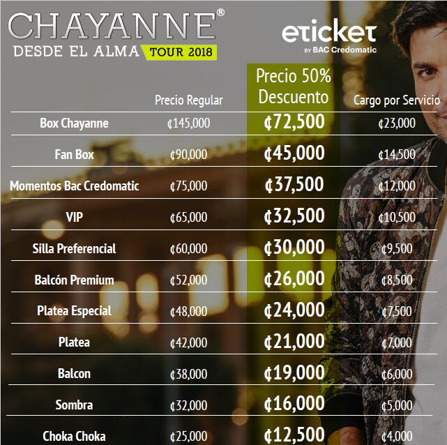 Los precios van de los ¢25.000 y hasta los ¢145.000, pero la compra de los boletos utilizando las tarjetas de BAC Credomatic y la Roja de BAC Credomatic tienen un 50% de descuento.