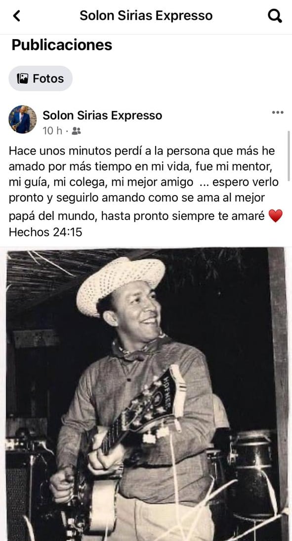 “Hace unos minutos perdí a la persona que más he amado por más tiempo en mi vida, fue mi mentor, mi guía, mi colega, mi mejor amigo... Espero verlo pronto y seguirlo amando como se ama al mejor padre del mundo, hasta pronto, siempre te amaré”, fue el mensaje con el cual Solón Sirias hijo se despidió de su padre.