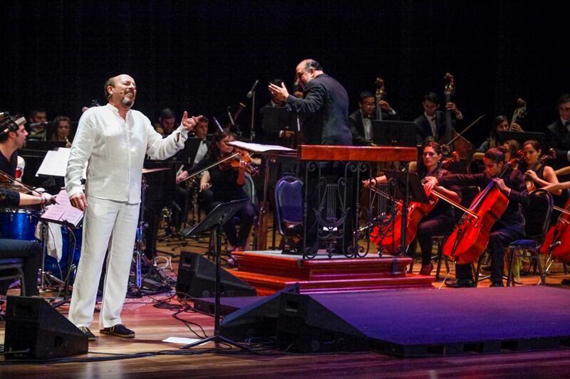 Con la batuta de Marvin Araya, la Orquesta Sinfónica Juvenil acompañó al músico por melodías y ritmos muy diversos, entre ellos Agualuna, El niño del Serengueti y Por tu amor me duele el aire , incluidas en el disco Sueño , que el español lanzó en el año 2011 con la Orquesta de Córdoba.