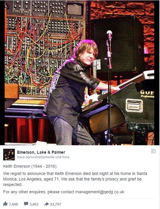 La noticia fue confirmada en la página de Facebook de la banda y en su sitio oficial. "Lamentamos anunciar que Keith Emerson murió anoche en su casa en Santa Monica, Los Ángeles, a los 71 años. Solicitamos que la privacidad y el luto de la familia sean respetados".