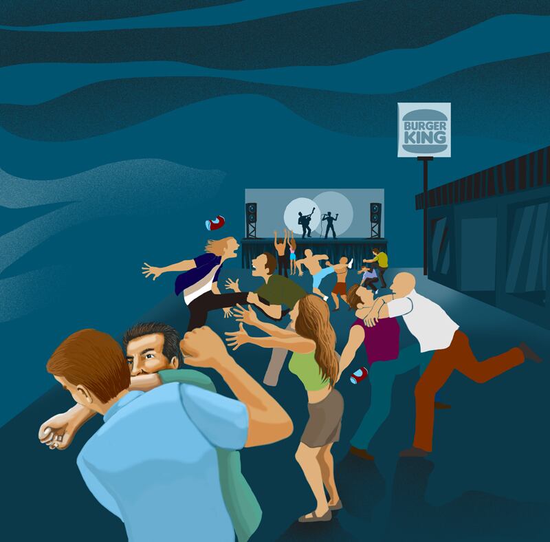 Siempre creí que el pandemonio se derivó del fallido concierto. Mi amigo Christian asegura que más bien se debió a rivalidades entre dos grupos de skaters . Podría discutírselo, pero como fue él quien recibió una pedrada en el ojo esa noche, mejor dejarlo ahí.