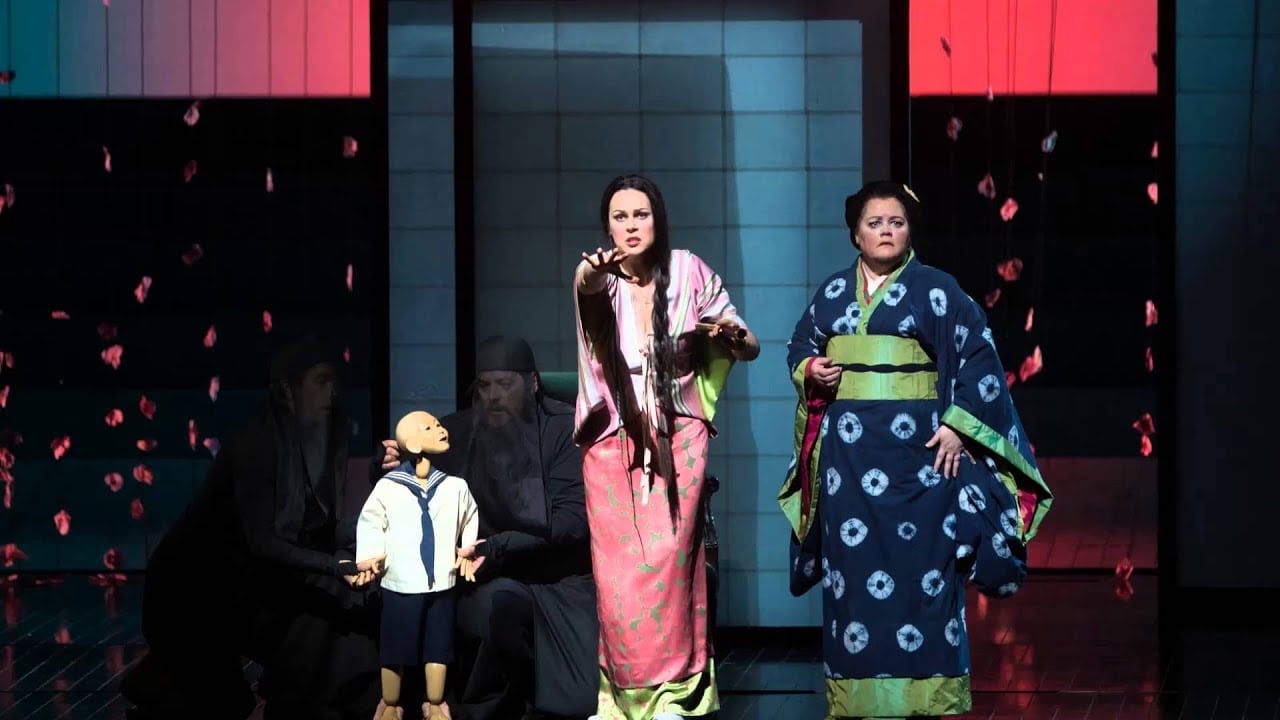 El libreto de esta ópera, estrenada en Milán en 1904, fue escrito por Giuseppe Giacosa y Luigi Illica. El texto se basa en el cuento Madama Chrysanthème, sobre una geisha que se convierte al cristianismo durante una pequeña misión norteamericana en Nagasaki, Japón.