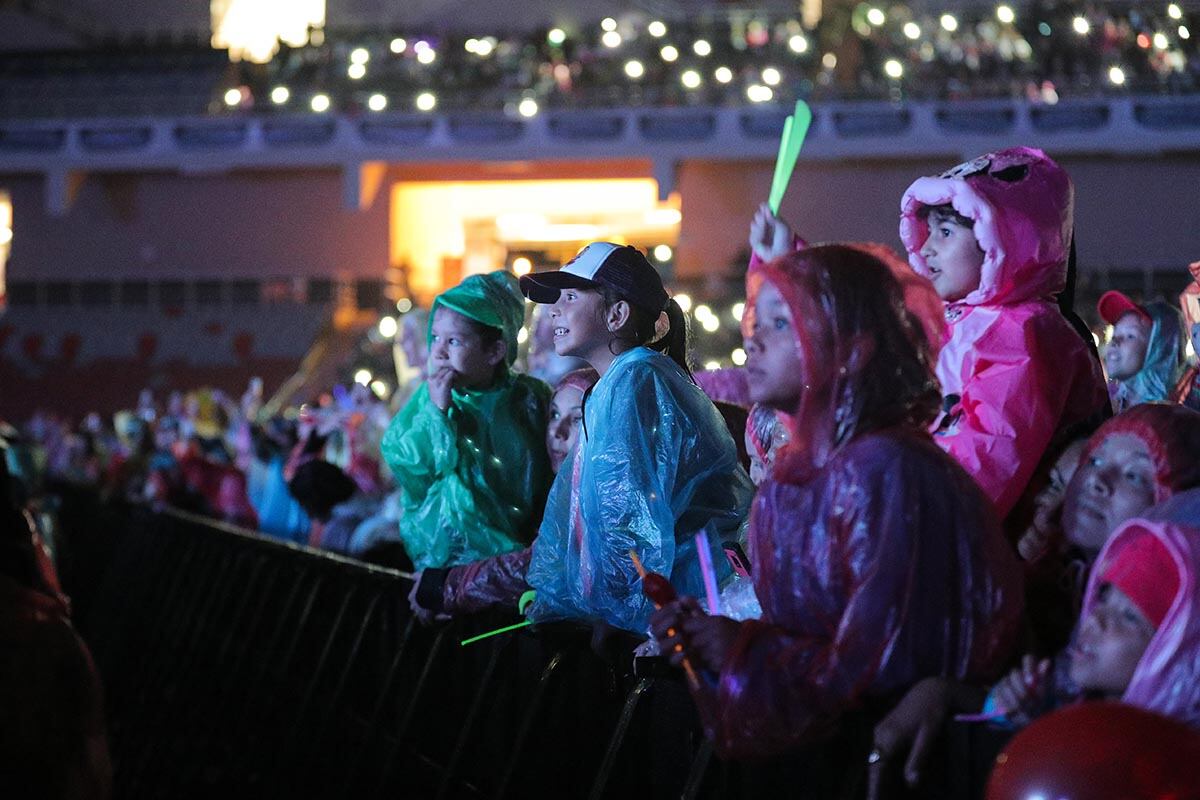 "¡Es que es un lindo!", gritó emocionada la menor de un grupo de tres hermanas, que veía el show desde la gramilla, con su mamá al lado y bien protegida por una capa.