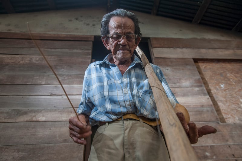 El quijongo guanacasteco es un instrumento de percusión que consta de un arco de madera y alambres metálicos conectados a una jícara y a una caja de resonancia.