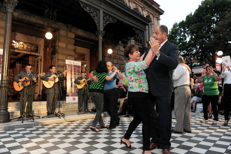 María Cecilia Díaz no podía dejar pasar la oportunidad. Pasó entre el grupo de gente que rodeaba al mandatario y lo sacó a bailar. “Fue un gran orgullo sacarlo a bailar. Él, con tanto cariño, me dijo: ‘Con mucho gusto’. Hasta me dijo, en broma: ‘Ahora Mercedes me pide el divorcio’”. Otras dos bailarinas compartirían canciones como Contigo aprendí y Linda Costa Rica con Solís.