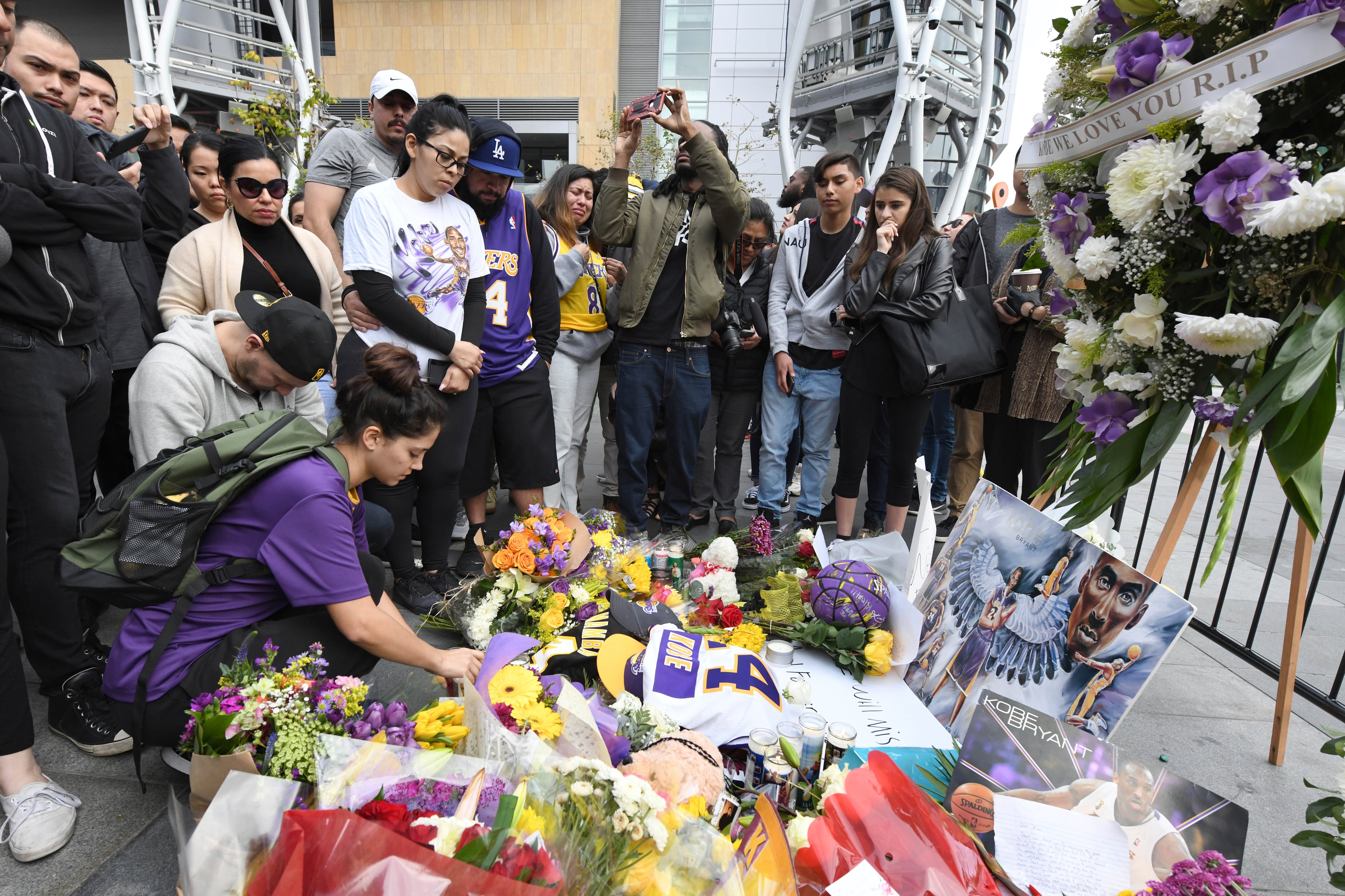 El acceso al Staples Center, que colocó sus banderas a media asta, estaba cerrado al público este domingo debido a los premios Grammy. Pero eso no impidió que cientos comenzaran a concentrarse en la L.A. Live Plaza ubicada justo al frente.