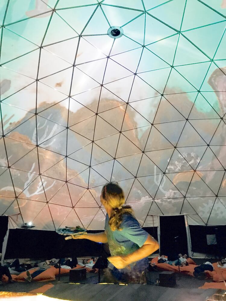 Con su empresa Luz Art, Francis Villalobos construyó un “domo geodésico” conformado por una tubería de acero inoxidable. Es un medio círculo recubierto por una lona de PVC que puede albergar, cómodamente, a 150 personas acostadas en el piso (los artistas invitan a los asistentes a que lleven almohadas para que estén lo más cómodos y relajados que puedan).