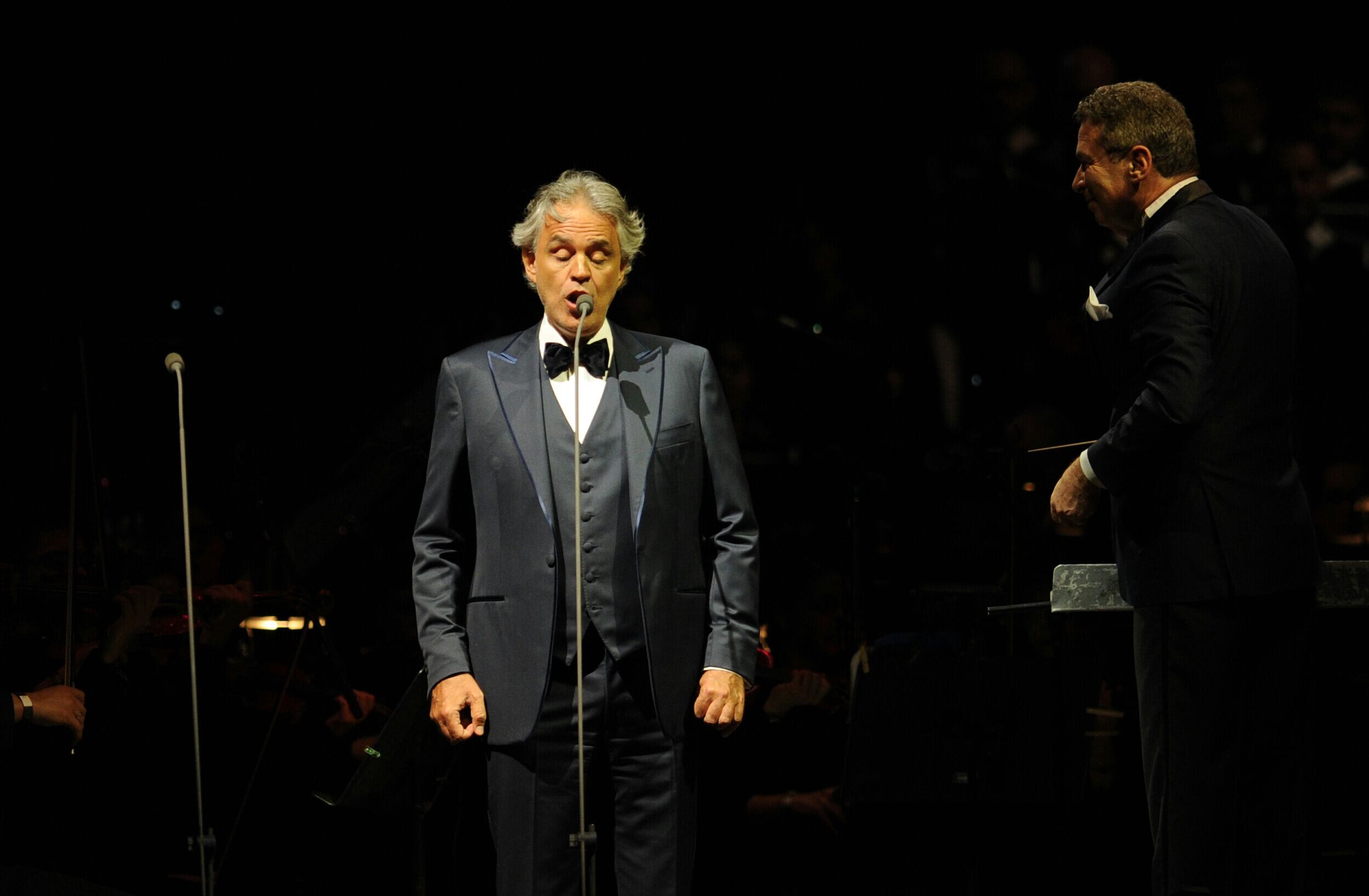 Acuerpado por la intensa Orquesta Sinfónica Nacional y las voces del Coro Sinfónico Nacional, ambas agrupaciones en pleno, llegó Bocelli tomado del brazo del director Eugene Kohn, quien lo llevó directo al micrófono para que abriera el recital con la interpretación de la famosa aria La donna è mobile, de la ópera Rigoletto. Un buen tino para emocionar a un público que agotó las entradas de este espectáculo, según la productora SD Concerts.