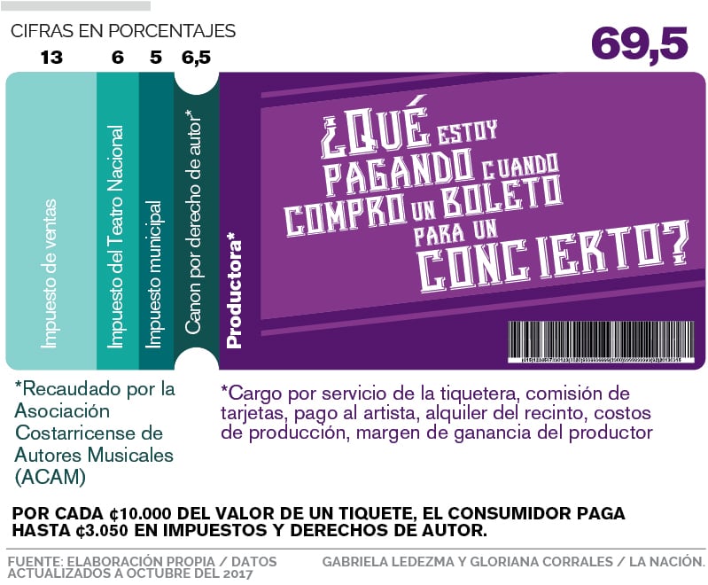 Del valor real de cada tiquete, los consumidores pagan un 13% de impuesto de ventas, un 6% al Teatro Nacional por el llamado Impuesto sobre Espectáculos Públicos (IEP) y un 5% a la municipalidad local, si el concierto se realiza dentro del Gran Área Metropolitana.