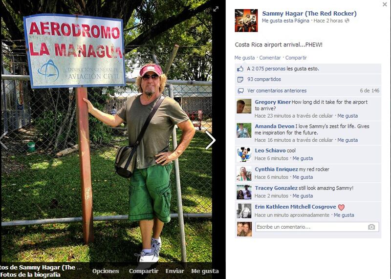 Hagar publicó esta semana dos fotografías de su visita al país en su perfil oficial de Facebook, en ellas comentó que estaba “amando a Costa Rica”.