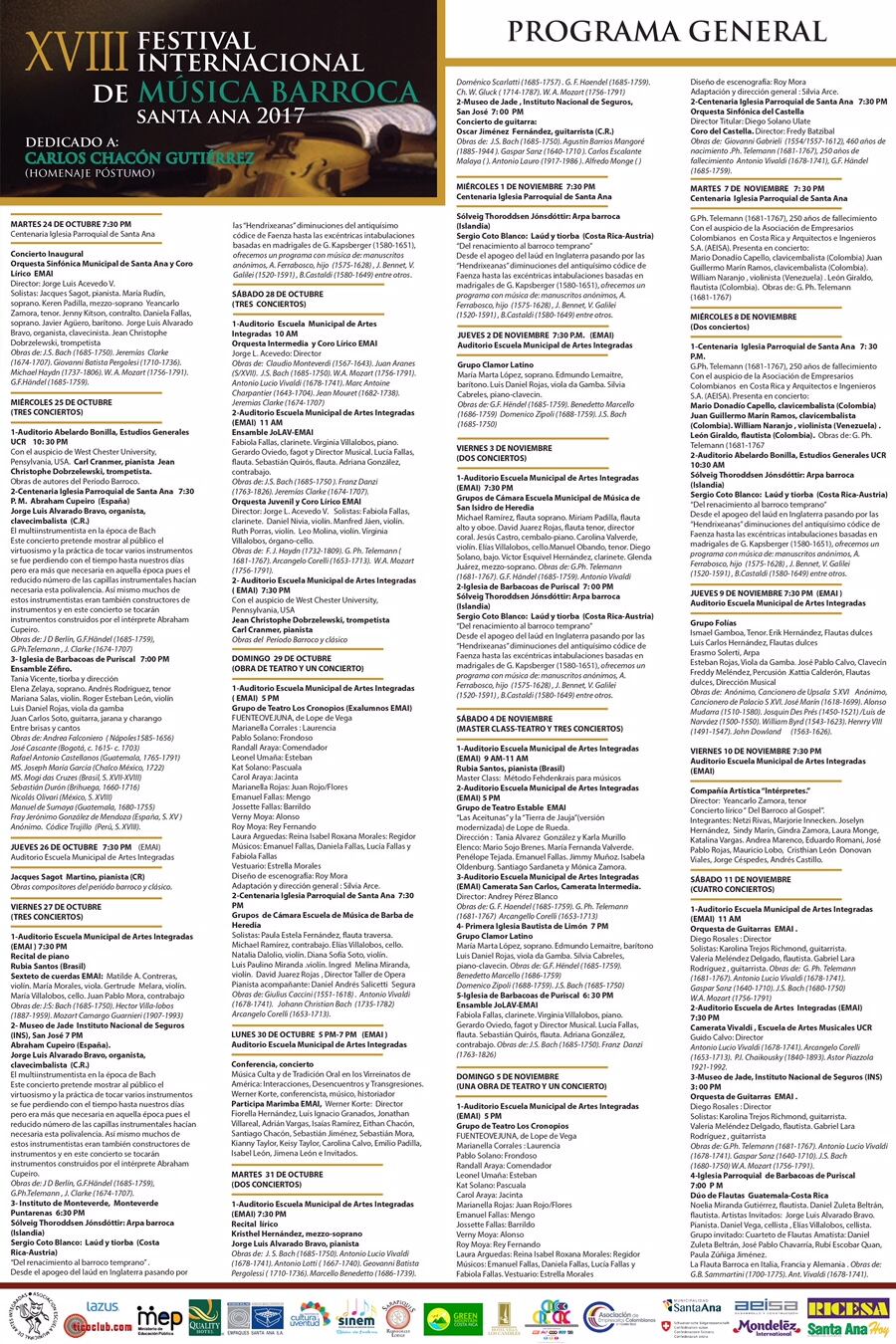 El concierto inaugural del martes 24 tendrá como solistas a los músicos nacionales Jacques Sagot (al piano), María Rudín (soprano), Keren Padilla (mezzo soprano), Yeancarlo Zamora (tenor), Daniela Fallas (soprano), Javier Agüero (barítono) y Jorge Luis Alvarado (órgano y clavecín). Los invitados internacionales serán la canadiense Jenny Kitson (contralto) y el estadounidense Jean-Christophe Dobrzelewski (trompeta).